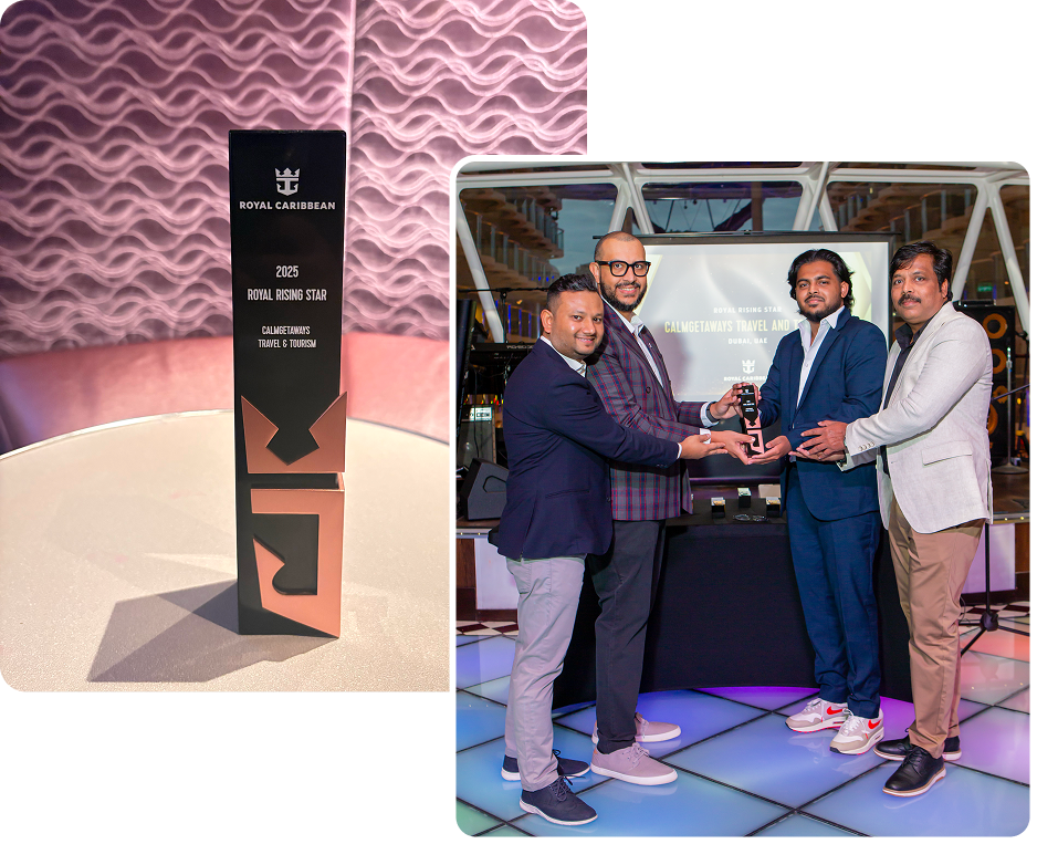 CalmGetaways has been honoured by Royal Caribbean with the Royal Rising Star Award — a testament to our dedication to making cruise travel simple, exciting, and accessible across the UAE and GCC. This recognition reflects our true spirit: expert guidance, genuine care, and unforgettable journeys at sea.